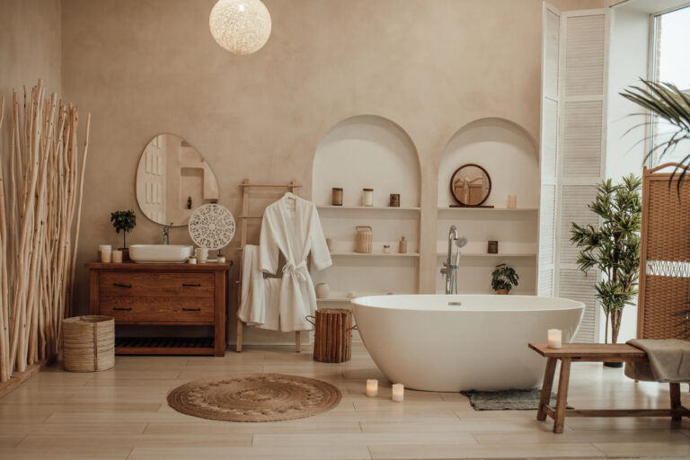 Les plantes vertes et fleurs séchées animent subtilement la pièce : quelques brins d’eucalyptus, une branche d’olivier ou des herbes de la pampa suffisent. Enfin, la lumière – naturelle ou tamisée – joue un rôle clé : elle révèle la texture des matériaux et souligne la sérénité de l’ensemble.